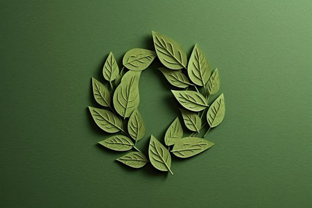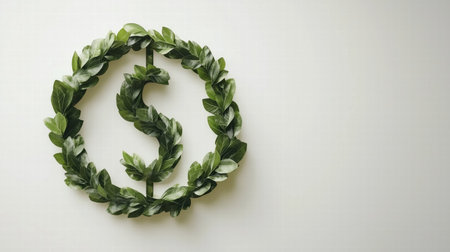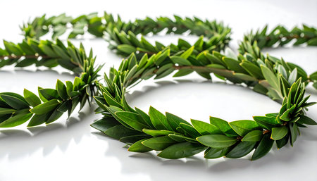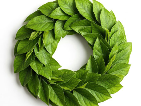 A close-up view presents a vibrant green wreath composed of lush leaves, arranged in a circular formation against a white backdrop. The composition showcases a smooth texture and balanced lighting. The image evokes themes of nature, celebration, and decorative design, suitable for a range of commercial applications.