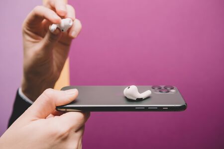 Bishkek, Kyrgyzstan - October 10, 2019: Man holds custom black airpods and connects them to iphone 11