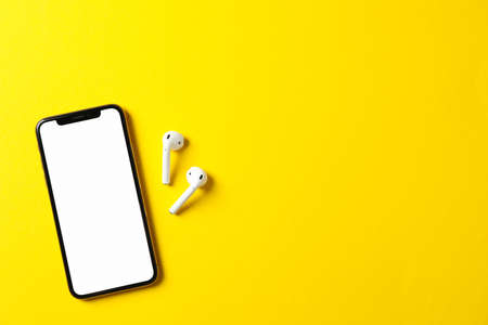 Rostov, Russia - July 06, 2020: Smartphone Apple iPhone 11 Pro of Midnight Green color and wireless headphones with opened charging case for active lifestyle on yellow background, top view, copy space