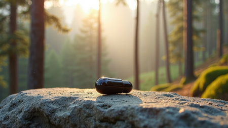 Black wireless earbud on forest rock at sunrise. That the image is generated using AI.