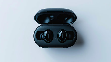 Top view of black earbuds in their charging case, isolated on white surface, showcasing modern wireless technology