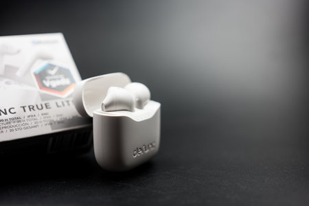 Bangkok, Thailand - February 21, 2024 : Earphones Defunc wireless headphones TRUE BASIC model with case for charging. The newest wireless earbuds