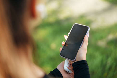 Mockup image. Hand hold cell smart mobile phone with blank white screen. White wireless earphones or headphones and smartphone over black background. Close up. Copy space.