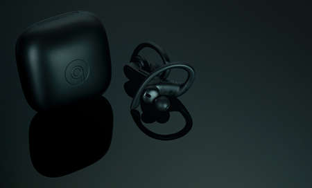 CHONBURI, THAILAND-DECEMBER 26, 2019 : Powerbeats Pro - Totally Wireless Earphones - Black and charging case. Workout earphones on dark background. Apple product. In ear wireless earphones. Earbuds.