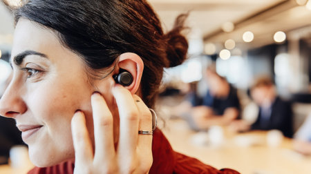 Closeup medium shot of a person adjusting a compact interpretation earpiece highlighting userfriendly design in a collaborative meeting space.