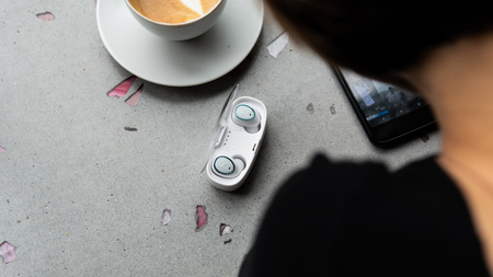 True wireless earbuds in case on natural stone background