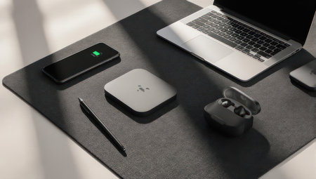 A modern workspace featuring a sleek phone and smart device beside a laptop on a wooden desk, complemented by a small plant, highlighting productivity and minimalism.