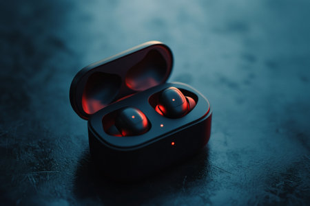 Two elegantly designed wireless earbuds rest within a compact charging case. Soft ambient light highlights their modern curves, creating a captivating and sophisticated atmosphere.