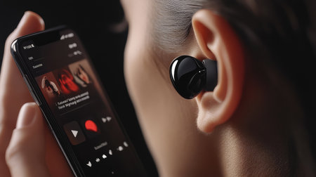 A close-up image showcasing a woman with a wireless earbud in her ear while using a smartphone to enjoy music or podcasts, emphasizing modern lifestyle and technology.