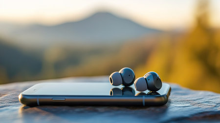 A pair of wireless earphones on a smartphone with a landscape view in the background