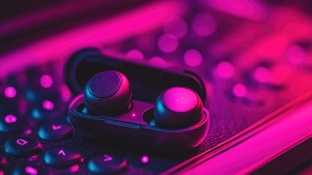 A pair of sleek wireless earbuds rests on a colorful neon background, showcasing modern technology and style. Ideal for music lovers seeking portability and comfort.