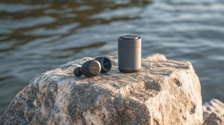 Stylish wireless earbuds with a charging case placed on a rocky surface by water. Perfect for showcasing modern audio technology in a serene natural setting.