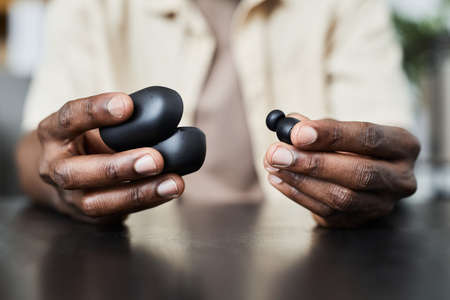 Close-up of African man sitting at the table and opening the case with wireless headphones