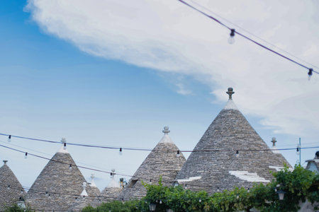 Iconic Trulli Houses with Conical Stone Roofs in Alberobello Puglia Under Blue Sky with Festive String Lights and Greenery