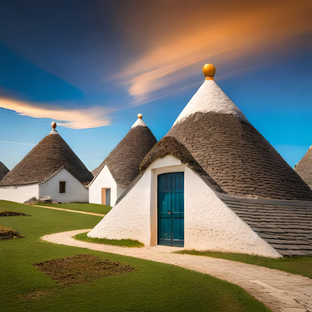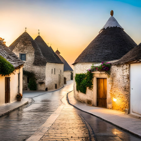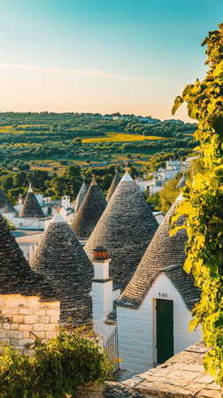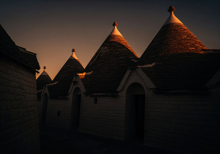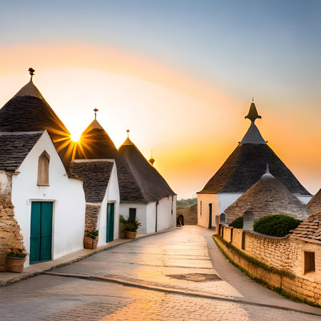Traditional trulli houses with distinctive conical roofs in puglia, italy, illuminated by the warm glow of sunset. ancient architecture and rustic charm.