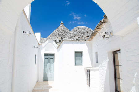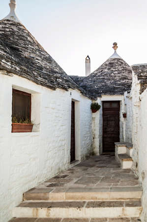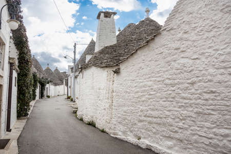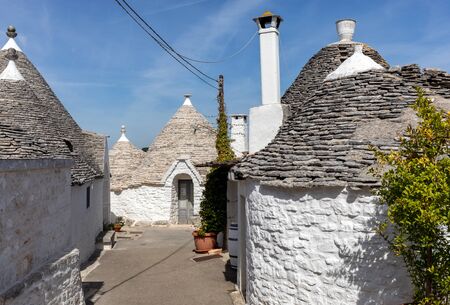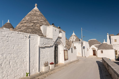 Trulli of Alberobello typical houses street view. Town of Alberobello, village with Trulli houses in Puglia Apulia region, Southern Italy