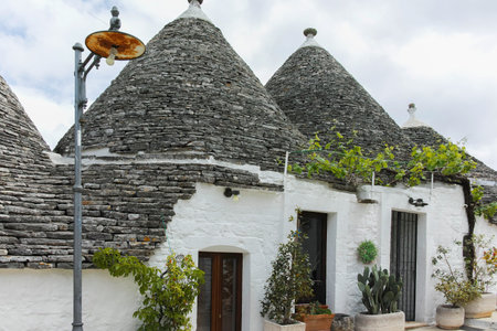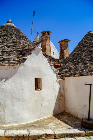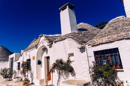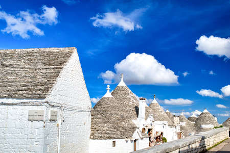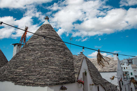 Alberobello, Italy - September 16, 2019: Trulli village in Alberobello, Italy. The style of construction is specific to the Murge area of the Italian region of Apulia (in Italian Puglia). Made of limestone and keystone.