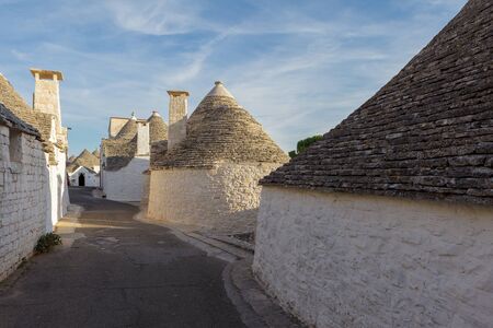 Incredible morning view of strret with trullo (trulli) - traditional Apulian dry stone hut with a conical roof. Sunny spring cityscape of Alberobello town, province of Bari, Apulia region, Italy, Europe.