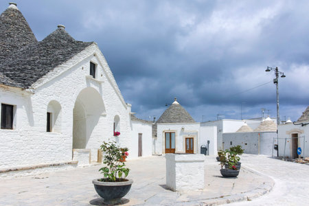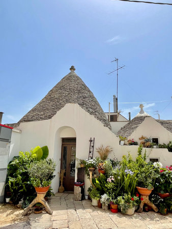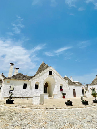 Alberobello, Italy - August 23 2021: Group of beautiful Trulli, traditional Apulian dry stone wall hut old houses with a conical roof in Alberobello, Puglia, Italy
