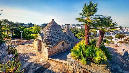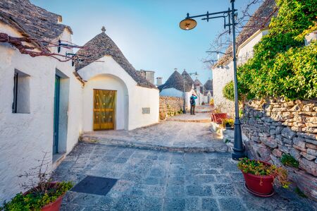 Amazing morning view of strret with trullo (trulli) - traditional Apulian dry stone hut with a conical roof. Impressive spring cityscape of Alberobello town, province of Bari, Apulia region, Italy, Europe.