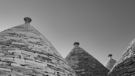 Black and white photo of historic Trulli houses with stone tile cone-shaped rooftops in Alberobello, Puglia, Southern Italy – UNESCO World Heritage Site architecture