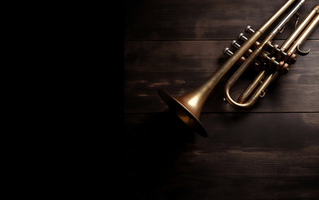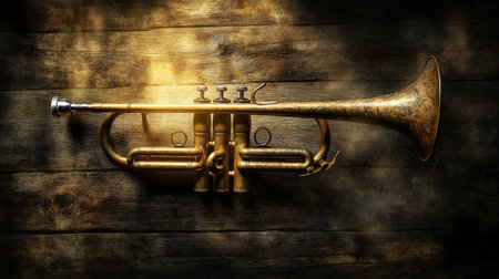 Captivating image of a vintage brass trumpet resting on a rustic wooden table, showcasing rich textures and warm lighting, perfect for musical themes.