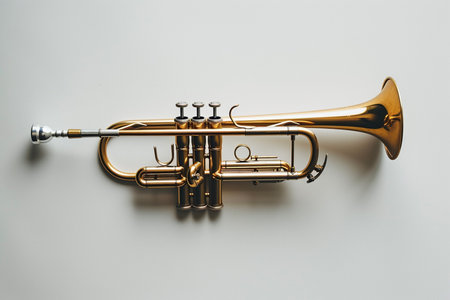A beautifully polished brass trumpet lies against a clean white background, showcasing its intricate design and artistic craftsmanship. Perfect for music-themed projects.