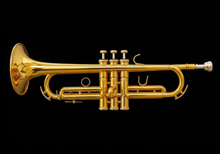 A golden trumpet is displayed against a stark black background. The instrument's shiny surface reflects light, highlighting its intricate details and classic design. Perfect for music enthusiasts.