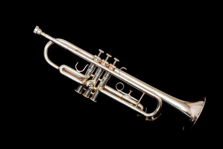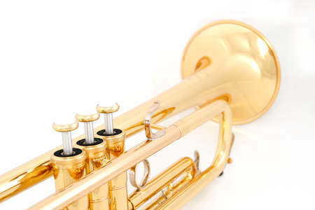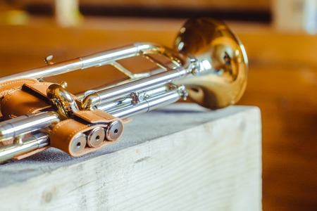 Golden trumpet brass musical instrument valve mouthpiece reflective shiny studio spotlight soft light
