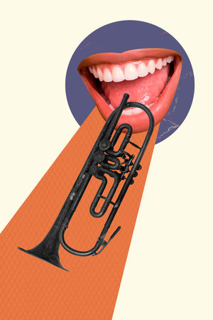 Vertical sketch 3d artwork collage poster of happy mouth smile play music pipe orchestra celebration musician event teeth