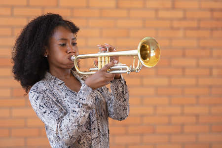 Portrait of a young afro american woman playing the trumpet outside on a brick wall background