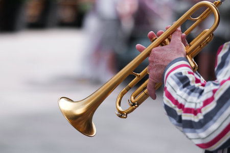trumpeter plays his trumpet in the brass band during live concert with vintage effect