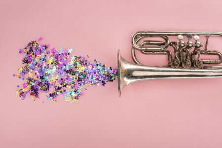 This image showcases a golden trumpet amidst a burst of colorful confetti and musical notes, radiating joy and celebration, perfect for creative projects.