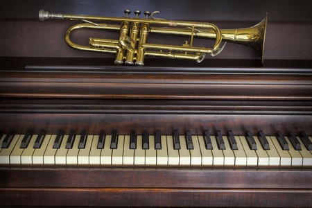Old and worn Jazz trumpet and piano keyboard musical show and performance