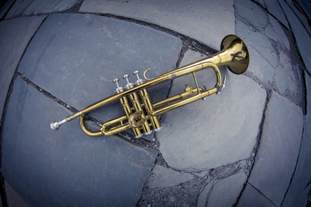 Old rusty Jazz instrument trumpet against distressed grunge background