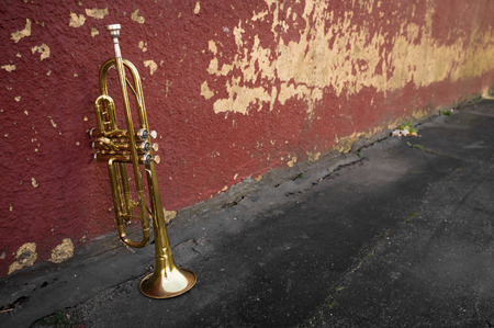 Old worn trumpet stands alone against a brick wall outside a jazz club