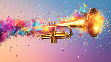 This vibrant image features a golden trumpet surrounded by colorful splashes of paint and confetti, perfect for conveying musical joy and creativity.