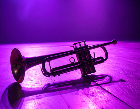 Trumpet resting on stage, waiting for the musician's touch, glowing under blue light, creating an atmosphere of anticipation and creativity
