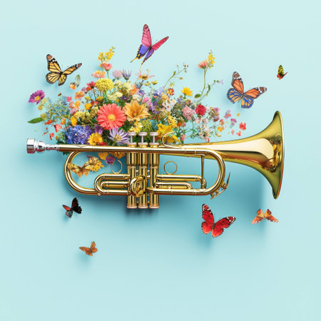 Vibrant trumpet surrounded by colorful flowers and butterflies, showcasing a lively spring atmosphere infused with music and nature