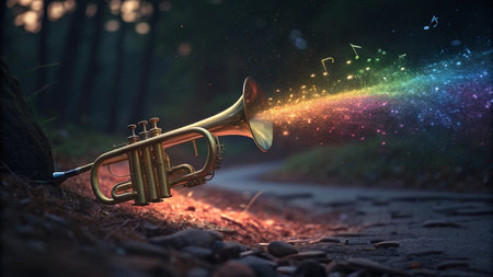 Golden trumpet emits a vibrant rainbow of musical notes in a forest setting.