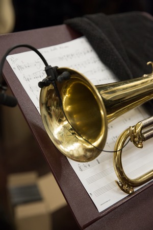 Trumpet on musical notes. Musical notes sheet and aged trumpet, top view. Musical background with vintage instrument.