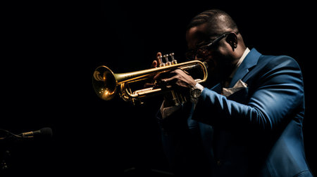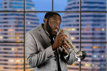 Professional musician on stage. Late evening trumpet performance. Black man playing trumpet music. Record studio in megalopolis.