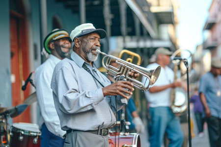 New Orleans - 04/15/2018: jazz man playing trumpet during exhibition in Bourbon Street, for the jazz festival