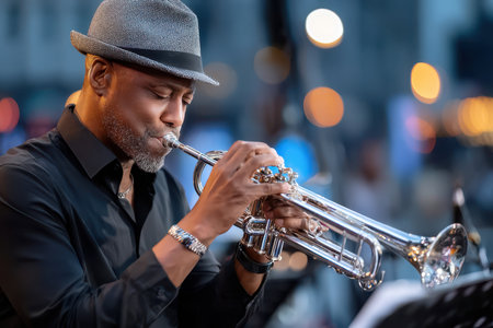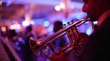 Closeup of a jazz musician playing the trumpet with vibrant bokeh lights
