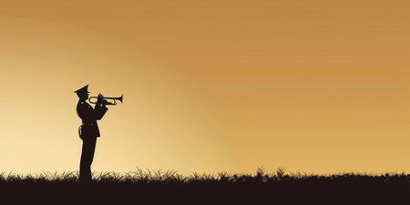 The silhouette of a man in a military uniform playing the trumpet at sunset