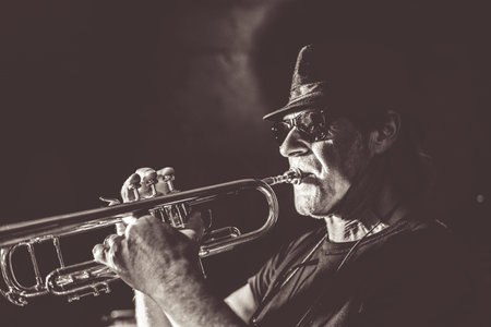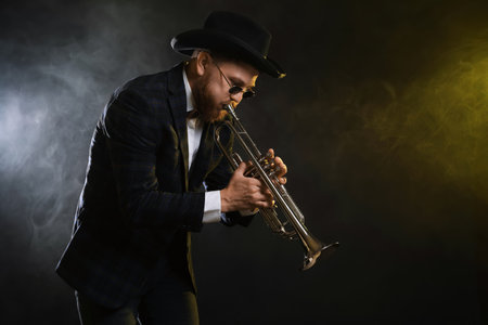 trumpet-player player playing jazz music instrument at the night club. High quality photo