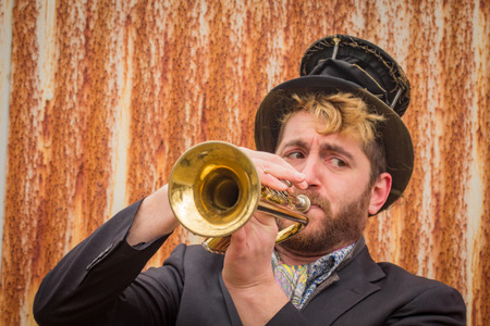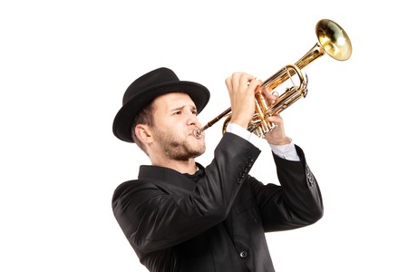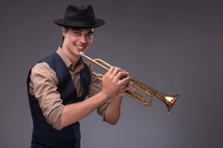 Waist-up portrait of a young handsome Caucasian jazz man in a suit with a black hat looking at the camera while holding a trumpet in his hand and playing on it, isolated on grey background with copy place