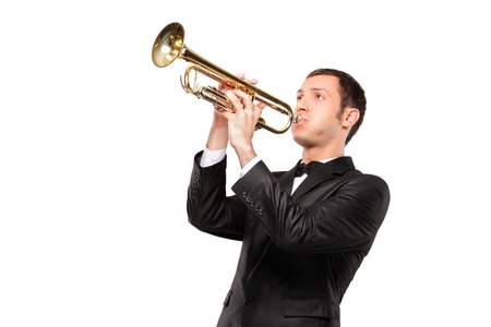 Waist-up portrait of a handsome young jazz man in a suit playing a trumpet and looking at the camera, concept of jazz music, isolated on grey background