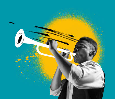 Creative retro design. Contemporary art collage of young stylish man playing hand-drawn trumpet isolated over blue-yellow background