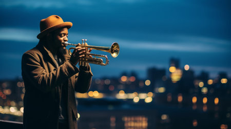 Rooftop trumpeter cityscape at night backdrop stunning city lights